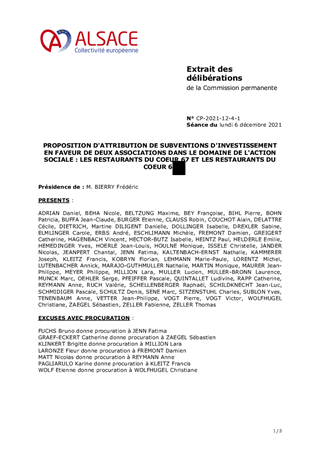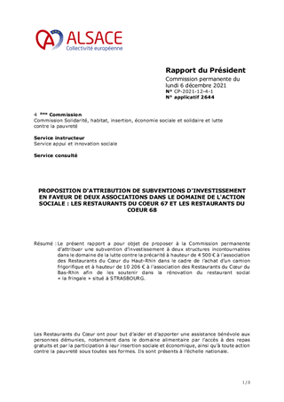 PROPOSITION D'ATTRIBUTION DE SUBVENTIONS D'INVESTISSEMENT EN FAVEUR DE DEUX ASSOCIATIONS DANS LE DOMAINE DE L'ACTION SOCIALE : LES RESTAURANTS DU COEUR 67 ET LES RESTAURANTS DU COEUR 68