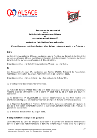 Le présent rapport a pour objet de proposer à la Commission permanente d’attribuer une subvention d’investissement à deux structures incontournables dans le domaine de la lutte contre la précarité à hauteur de 4 500 € à l’association des Restaurants du Cœur du Haut-Rhin dans le cadre de l’achat d’un camion frigorifique et à hauteur de 10 206 € à l’association des Restaurants du Cœur du Bas-Rhin afin de les soutenir dans la rénovation du restaurant social « la fringale » situé à STRASBOURG.