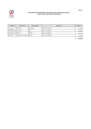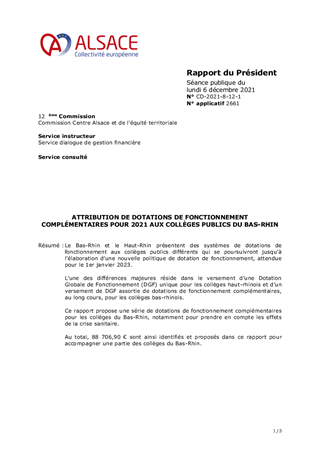 Le Bas-Rhin et le Haut-Rhin présentent des systèmes de dotations de fonctionnement aux collèges publics différents qui se poursuivront jusqu’à l’élaboration d’une nouvelle politique de dotation de fonctionnement, attendue pour le 1er janvier 2023. L’une des différences majeures réside dans le versement d’une Dotation Globale de Fonctionnement (DGF) unique pour les collèges haut-rhinois et d’un versement de DGF assortie de dotations de fonctionnement complémentaires, au long cours, pour les collèges bas-rhinois. Ce rapport propose une série de dotations de fonctionnement complémentaires pour les collèges du Bas-Rhin, notamment pour prendre en compte les effets de la crise sanitaire. Au total, 88 706,90 € sont ainsi identifiés et proposés dans ce rapport pour accompagner une partie des collèges du Bas-Rhin.