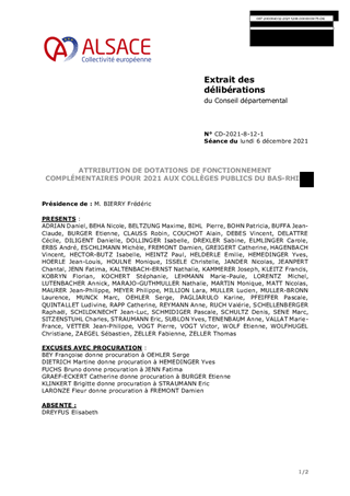 ATTRIBUTION DE DOTATIONS DE FONCTIONNEMENT COMPLÉMENTAIRES POUR 2021 AUX COLLÈGES PUBLICS DU BAS-RHIN