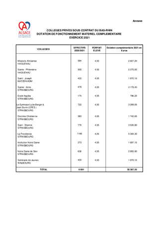Le Bas-Rhin et le Haut-Rhin présentent des systèmes de dotations de fonctionnement aux collèges privés différents. Le travail d’analyse et de modélisation actuellement déployé pour les collèges publics alsaciens en vue du vote par le Conseil d’une politique de dotation de fonctionnement harmonisée à l’échelle de l’Alsace pour le 1er janvier 2023, permettra dans le prolongement d’aboutir également à des dotations de fonctionnement harmonisées pour les collèges privés alsaciens sous contrat. Les collèges privés sous contrat bénéficient d'une dotation de fonctionnement matériel calculée sur la base d'un forfait par élève fixé à partir du coût moyen d'un élève externe de l'enseignement public majoré d'un pourcentage permettant de couvrir les charges diverses dont les établissements publics sont dégrevés. Afin de tenir compte des dotations de fonctionnement complémentaires allouées aux collèges publics du Bas-Rhin au cours de l’exercice 2021 (viabilisation, chauffage urbain, autres dépenses) des dotations de fonctionnement matériel des collèges privés sous contrat du Bas-Rhin doivent être ajustées. Le présent rapport a pour objet de proposer au Conseil de la Collectivité européenne d’Alsace de décider d'attribuer pour 2021 des dotations de fonctionnement complémentaires pour un montant total de 30 307,55 € aux 13 collèges privés du Bas-Rhin sous contrat.