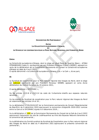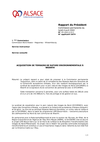 Le présent rapport a pour objet de proposer à la Commission permanente l’acquisition, dans le cadre de la compétence des Espaces Naturels Sensibles de la Collectivité européenne d'Alsace, d’un site restauré écologiquement par le syndicat de coopération pour le parc naturel des Vosges du Nord (SYCOPARC) à Woerth et la signature d’une convention de partenariat avec le SYCOPARC. Cette transaction concerne 5 parcelles, pour une surface totale de 280,61 ares et à un prix de 142 888,62 €, frais de portage et de gestion en sus.