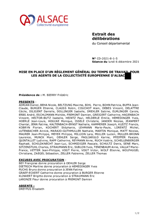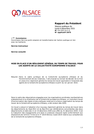 Dans le cadre juridique de la Collectivité européenne d’Alsace et du fonctionnement de ses instances, il est proposé au Conseil de décider de la mise en place d’un règlement général du temps de travail applicable à l’ensemble des agents de la Collectivité européenne d’Alsace à partir du 1er janvier 2022.