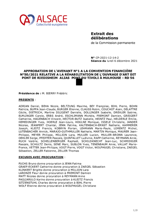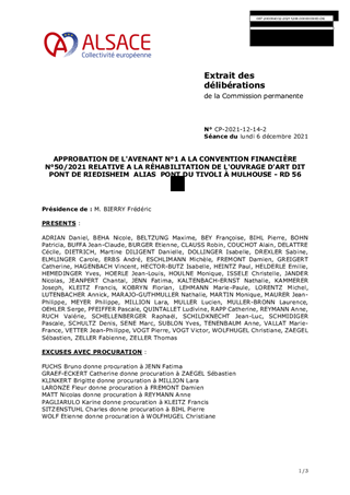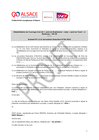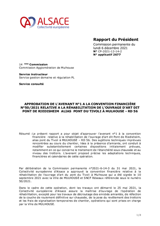APPROBATION DE L'AVENANT N°1 A LA CONVENTION FINANCIÈRE N°50/2021 RELATIVE A LA RÉHABILITATION DE L'OUVRAGE D'ART DIT PONT DE RIEDISHEIMALIASPONT DU TIVOLI À MULHOUSE - RD 56