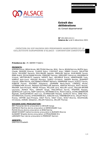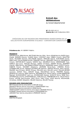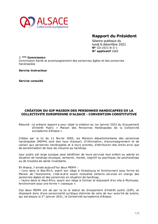 Le présent rapport a pour objet la création au 1er janvier 2022 du Groupement d’Intérêt Public « Maison des Personnes Handicapées de la Collectivité européenne d’Alsace ».