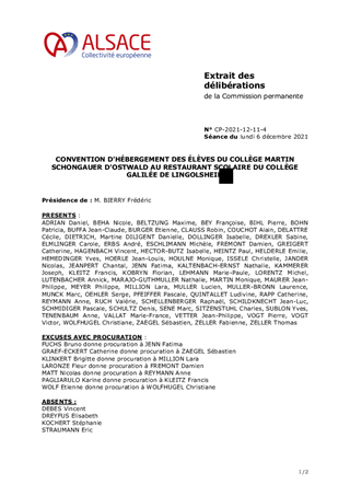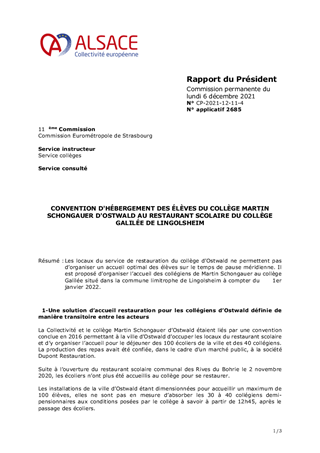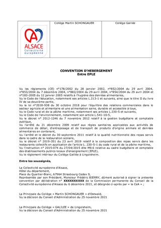 CONVENTION D'HÉBERGEMENT DES ÉLÈVES DU COLLÈGE MARTIN SCHONGAUER D'OSTWALD AU RESTAURANT SCOLAIRE DU COLLÈGE GALILÉE DE LINGOLSHEIM