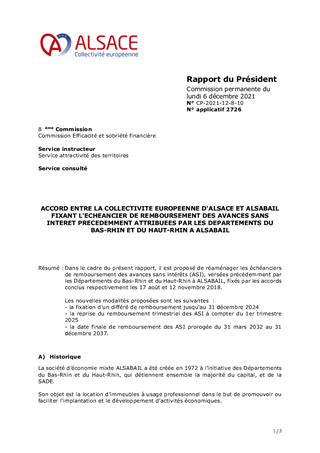 Dans le cadre du présent rapport, il est proposé de réaménager les échéanciers de remboursement des avances sans intérêts (ASI), versées précédemment par les Départements du Bas-Rhin et du Haut-Rhin à ALSABAIL, fixés par les accords conclus respectivement les 17 août et 12 novembre 2018. Les nouvelles modalités proposées sont les suivantes : - la fixation d'un différé de remboursement jusqu'au 31 décembre 2024 - la reprise du remboursement trimestriel des ASI à compter du 1er trimestre 2025 - la date finale de remboursement des ASI prorogée du 31 mars 2032 au 31 décembre 2037.