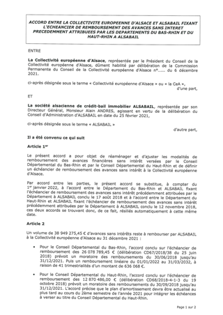 ACCORD ENTRE LA COLLECTIVITE EUROPEENNE D'ALSACE ET ALSABAIL FIXANT L'ECHEANCIER DE REMBOURSEMENT DES AVANCES SANS INTERET PRECEDEMMENT ATTRIBUEES PAR LES DEPARTEMENTS DU BAS-RHIN ET DU HAUT-RHIN A ALSABAIL