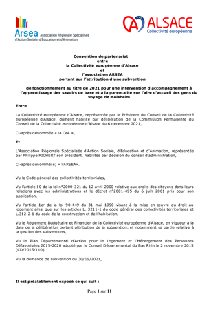 Le comité de suivi de la gestion de l'aire d'accueil des gens du voyage de Molsheim réuni le 20 mai 2021 a souhaité la mise en œuvre d'un groupe de travail pour accompagner la scolarisation des enfants séjournant régulièrement sur l'aire d'accueil. Après une première expérience d'ateliers pédagogiques basés sur la méthode Montessori pour des enfants de 6 à 11 ans, il est proposé de soutenir le projet "expérimentation d'un soutien à l'apprentissage des savoirs de base et à la parentalité ", pour des jeunes de 11 à 16 ans non scolarisés ou déscolarisés présenté par l'ARSEA, par l'attribution d'une subvention de fonctionnement de 9 500 €. Cette subvention s'inscrirait dans le cadre du déploiement des actions coordonnées par le Centre social de Ressources Gens du Voyage (CEDRE GDV 67) agréé par la CAF du Bas-Rhin depuis octobre 2018 (rapport CD67- CP/2018/431).