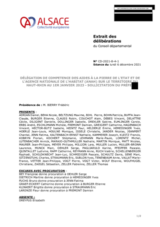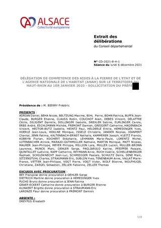 Le présent rapport a pour objet de proposer au Conseil de la Collectivité européenne d'Alsace de solliciter le Préfet du Haut-Rhin pour la prise de la délégation de compétence des aides à la pierre de l'Etat et de l'Agence Nationale de l'Habitat (ANAH) sur le territoire haut-rhinois, hors Mulhouse Alsace Agglomération, au 1er janvier 2023. Cette délégation, en place dans le Bas-Rhin, hors Eurométropole de Strasbourg, permet de délivrer les agréments et d'attribuer des aides publiques en faveur de la construction, l'acquisition et la réhabilitation des logements locatifs sociaux et d'attribuer des aides en faveur de la rénovation du parc privé, de la location-accession et de la création de places d'hébergement conformément à l'article L 301-5-2 du Code de la Construction et de l'Habitation. Cette extension de la délégation à l’échelle alsacienne est un acte fondateur du service de l'habitat alsacien. Elle ouvre l’accès à la Collectivité européenne d’Alsace à des moyens financiers et une légitimité à la hauteur de ses ambitions sur l’habitat. Elle permet de répondre en outre à des enjeux de lutte contre le réchauffement climatique, de soutien fort à l'économie de proximité et d'attractivité des territoires et consolide son action publique en matière d’insertion, d’autonomie, de transition énergétique et d’aménagement du territoire. La Collectivité européenne d'Alsace doit obligatoirement se positionner auprès des services de l'Etat sur la suite donnée à la délégation de compétence au plus tard le 31/12/2022, soit un an avant la fin de la délégation de compétence du Bas-Rhin. Elle doit cependant faire connaître son souhait de se positionner un an avant la date de prise de délégation souhaitée, soit pour une prise de délégation au 01/12/2023, au plus tard le 31/12/2021.