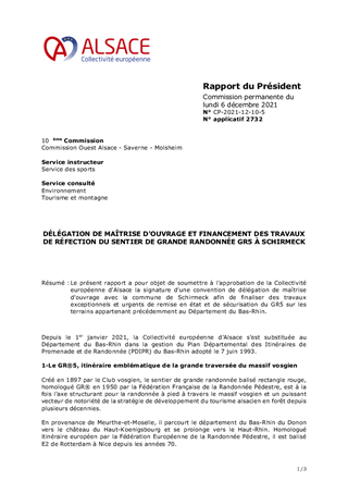Le présent rapport a pour objet de soumettre à l'approbation de la Collectivité européenne d'Alsace la signature d'une convention de délégation de maîtrise d'ouvrage avec la commune de Schirmeck afin de finaliser des travaux exceptionnels et urgents de remise en état et de sécurisation du GR5 sur les terrains appartenant précédemment au Département du Bas-Rhin.