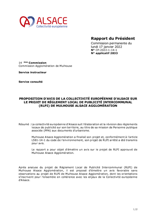 La collectivité européenne d’Alsace suit l’élaboration et la révision des règlements locaux de publicité sur son territoire, au titre de sa mission de Personne publique associée (PPA) aux documents d’urbanisme. Mulhouse Alsace Agglomération a finalisé son projet et, conformément à l'article L581-14-1 du code de l’environnement, son projet de RLPI arrêté a été transmis pour avis. Le rapport a pour objet d'émettre un avis sur le projet de RLPI approuvé de Mulhouse Alsace Agglomération.