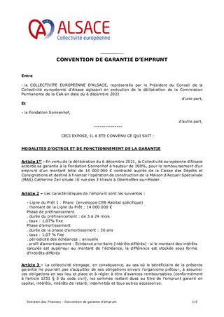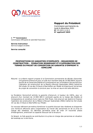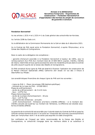 Le présent rapport propose à la Commission permanente de décider d’accorder une garantie d’emprunt pour un prêt d’un montant total de 14 000 000 € souscrit auprès de la Caisse des Dépôts et Consignations par la Fondation Sonnenhof pour l’opération de construction de la Maison d’Accueil Spécialisée (MAS) Catherine Zell située 10 rue des 3 tilleuls à Oberhoffen-sur-Moder et d’approuver les termes du projet de convention à conclure pour la mise en œuvre de cette décision.
