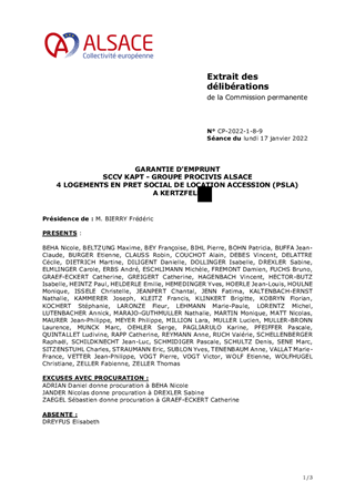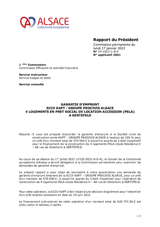Il vous est proposé d’accorder la garantie d'emprunt à la Société civile de construction vente KAPT – GROUPE PROCIVIS ALSACE à hauteur de 100 % pour un prêt d’un montant total de 570 000 € à souscrire auprès du Crédit Coopératif pour le financement de la construction de 4 logements PSLA situés Résidence K – 8A rue de Stotzheim à KERTZFELD.