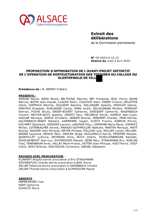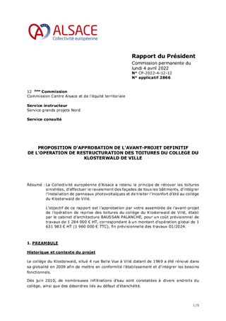 La Collectivité européenne d’Alsace a retenu le principe de rénover les toitures sinistrées, d’effectuer le ravalement des façades de tous les bâtiments, d’intégrer l’installation de panneaux photovoltaïques et de traiter l’inconfort d’été au collège du Klosterwald de Villé. L’objectif de ce rapport est l’approbation par votre assemblée de l’avant-projet de l’opération de reprise des toitures du collège du Klosterwald de Villé, établi par le cabinet d’architecture BAUSSAN PALANCHE, pour un coût prévisionnel de travaux de 1 284 000 € HT, correspondant à un montant d'opération global de 1 631 983 € HT (1 960 000 € TTC), fin prévisionnelle des travaux 01/2024.
