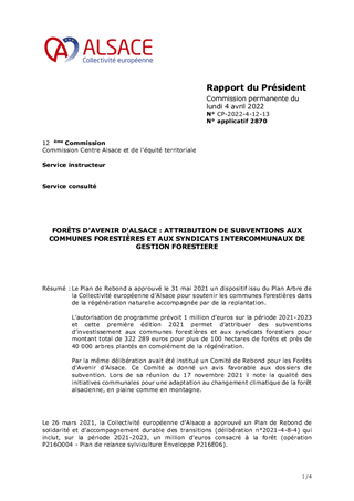 Le Plan de Rebond a approuvé le 31 mai 2021 un dispositif issu du Plan Arbre de la Collectivité européenne d’Alsace pour soutenir les communes forestières dans de la régénération naturelle accompagnée par de la replantation. L’autorisation de programme prévoit 1 million d’euros sur la période 2021-2023 et cette première édition 2021 permet d’attribuer des subventions d’investissement aux communes forestières et aux syndicats forestiers pour montant total de 322 289 euros pour plus de 100 hectares de forêts et près de 40 000 arbres plantés en complément de la régénération. Par la même délibération avait été institué un Comité de Rebond pour les Forêts d’Avenir d’Alsace. Ce Comité a donné un avis favorable aux dossiers de subvention. Lors de sa réunion du 17 novembre 2021 il note la qualité des initiatives communales pour une adaptation au changement climatique de la forêt alsacienne, en plaine comme en montagne.