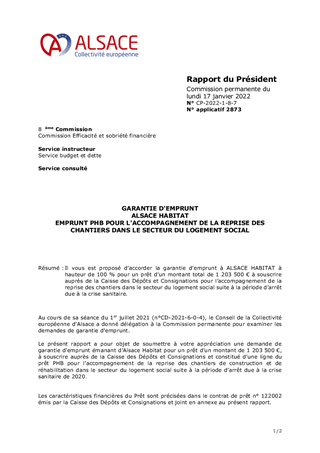 GARANTIE D'EMPRUNT ALSACE HABITAT EMPRUNT PHB POUR L'ACCOMPAGNEMENT DE LA REPRISE DES CHANTIERS DANS LE SECTEUR DU LOGEMENT SOCIAL