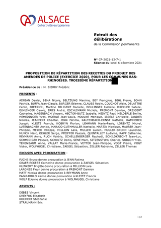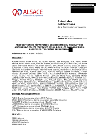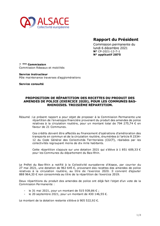 PROPOSITION DE RÉPARTITION DES RECETTES DU PRODUIT DES AMENDES DE POLICE (EXERCICE 2020), POUR LES COMMUNES BAS-RHINOISES. TROISIÈME RÉPARTITION.