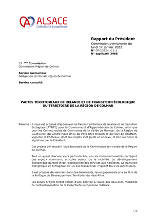Il vous est proposé d’approuver les Pactes territoriaux de relance et de transition écologique (PTRTE) pour la Communauté d’Agglomération de Colmar, ainsi que pour les Communautés de Communes de la Vallée de Munster, de la Région de Guebwiller, du Centre Haut-Rhin, du Pays Rhin-Brisach et du Pays de Rouffach, Vignoble et Châteaux, dont les projets sont joints en annexe, et d’en autoriser la signature par le Président. Ces projets ont recueilli l’avis favorable de la Commission territoriale de la Région de Colmar. Tout en ayant chacune leurs particularités, ces six intercommunalités partagent des enjeux communs, articulés autour de la mobilité, du développement économique durable et de l’accessibilité des services aux habitants. La transition énergétique et écologique est un axe transversal irriguant tous les autres axes. Il est proposé de valoriser dans ces documents, les engagements pris au titre de la Politique de Développement Territorial du Haut-Rhin. Les futurs projets feront l’objet d’une analyse à l’aune des nouvelles modalités de contractualisation de la Collectivité européenne d’Alsace.