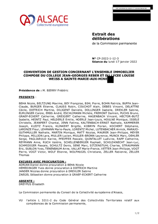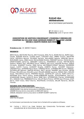 Le présent rapport a pour objet d’approuver le projet de convention de gestion de l’ensemble immobilier situé à SAINTE-MARIE-AUX-MINES, établie entre la Collectivité européenne d’Alsace, la Région Grand Est et les deux établissements concernés