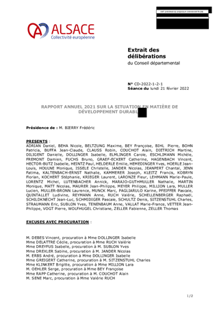 Avec les actions menées antérieurement par les Départements du Haut-Rhin et du Bas Rhin, la Collectivité européenne d’Alsace est de fait un acteur engagé de longue date en faveur du développement durable. Ses politiques innovantes en matière d’accompagnement des territoires et des personnes en témoignent. Elles s’inscrivent à la fois dans une réflexion d’avenir et dans une volonté d’ancrage de proximité. L’année 2021 est celle du premier rapport de situation en matière de développement durable pour la Collectivité européenne d’Alsace. Ce rapport a fait l’objet d’un avis favorable de la Commission aux dynamiques économiques, touristique, agricole, à l’emploi et aux transitions énergétiques et climatiques réunie le 3 janvier 2022. Il représente un outil d’aide à la décision et de travail pour les élus et les agents de la Collectivité. Le bilan des actions menées présente également des pistes d’amélioration, de nouvelles transversalités et de créativité de la Collectivité en interne et/ou avec ses partenaires.
