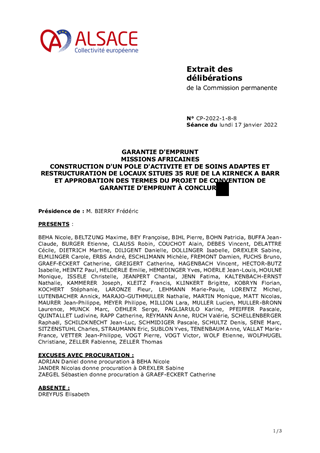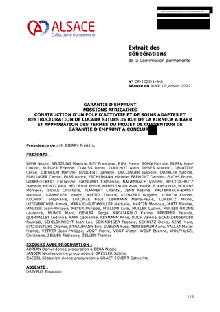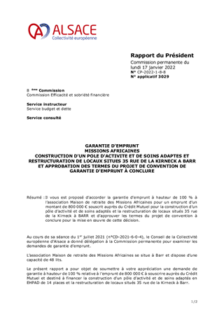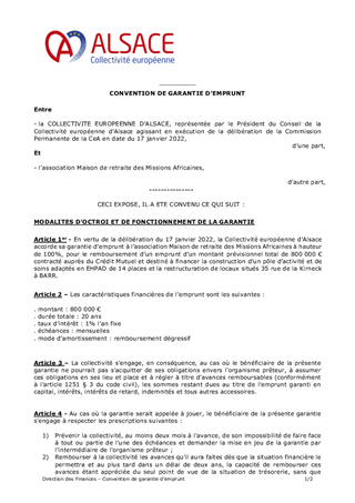 Il vous est proposé d’accorder la garantie d'emprunt à hauteur de 100 % à l’association Maison de retraite des Missions Africaines pour un emprunt d’un montant de 800 000 € souscrit auprès du Crédit Mutuel pour la construction d’un pôle d’activité et de soins adaptés et la restructuration de locaux situés 35 rue de la Kirneck à BARR et d’approuver les termes du projet de convention à conclure pour la mise en œuvre de cette décision.