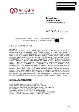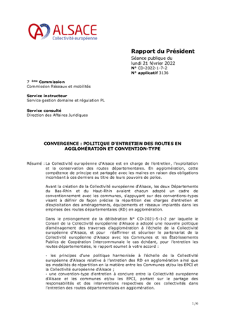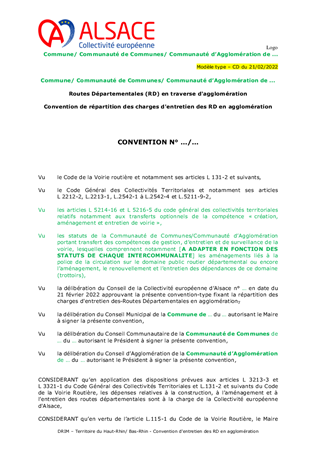 La Collectivité européenne d’Alsace est en charge de l’entretien, l'exploitation et la conservation des routes départementales. En agglomération, cette compétence de principe est partagée avec les maires en raison des obligations incombant à ces derniers au titre de leurs pouvoirs de police. Avant la création de la Collectivité européenne d’Alsace, les deux Départements du Bas-Rhin et du Haut-Rhin avaient chacun adopté un cadre de conventionnement avec les communes, s'appuyant sur des conventions-types visant à définir de façon précise la répartition des charges d’entretien et d’exploitation des aménagements, équipements et réseaux implantés dans les emprises des routes départementales (RD) en agglomération. Dans le prolongement de la délibération N° CD-2021-5-1-2 par laquelle le Conseil de la Collectivité européenne d’Alsace a adopté une nouvelle politique d’aménagement des traverses d’agglomération à l’échelle de la Collectivité européenne d’Alsace, et pour réaffirmer et sécuriser le partenariat de la Collectivité européenne d’Alsace avec les Communes et les Établissements Publics de Coopération Intercommunale le cas échéant, pour l’entretien les routes départementales, le rapport soumet à votre accord : - les principes d’une politique harmonisée à l’échelle de la Collectivité européenne d’Alsace relative à l’entretien des RD en agglomération ainsi que les modalités de répartition en la matière entre les Communes et/ou les EPCI et la Collectivité européenne d’Alsace ; - une convention-type d’entretien à conclure entre la Collectivité européenne d’Alsace et les communes et/ou les EPCI, portant sur le partage des responsabilités et des interventions respectives de ces collectivités dans l’entretien des routes départementales en agglomération.