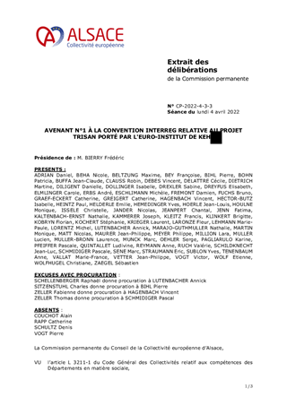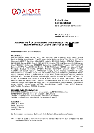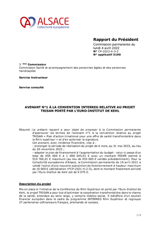 Le présent rapport a pour objet de proposer à la Commission permanente d’approuver les termes de l’avenant n°1 à la convention relative au projet TRISAN « Plan d’action trinational pour une offre de santé transfrontalière dans le Rhin supérieur » et d’en autoriser la signature. Cet avenant, avec incidence financière, vise à : - prolonger la période de réalisation du projet de 6 mois, au 31 mai 2023, au lieu du 30 novembre 2022 ; - adapter le plan de financement à l’augmentation du budget : celui-ci passe d’un total de 955 000 € à 1 098 045,01 € avec un montant FEDER estimé à 519 760,01 € maximum (au lieu de 453 000 € validés précédemment). Pour la Collectivité européenne d’Alsace, la Commission permanente du 19 avril 2021 a validé l’octroi d’une nouvelle subvention de fonctionnement à hauteur maximum de 10 000 € (délibération n°CP-2021-4-2-3), dont le montant finalement sollicité par l'Euro-Institut de Kehl est de 9 075 €.