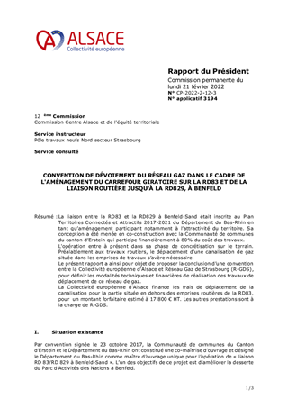CONVENTION DE DÉVOIEMENT DU RÉSEAU GAZ DANS LE CADRE DE L'AMÉNAGEMENT DU CARREFOUR GIRATOIRE SUR LA RD83 ET DE LA LIAISON ROUTIÈRE JUSQU'À LA RD829, À BENFELD