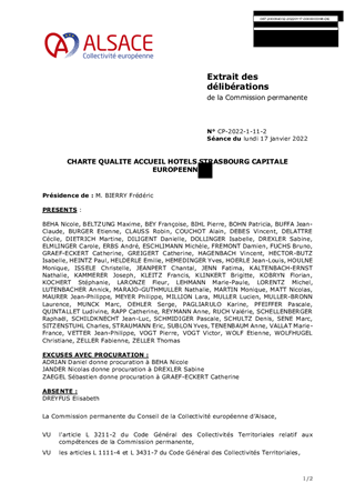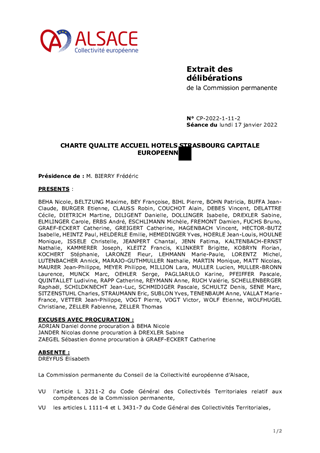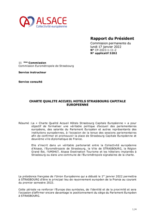 La « Charte Qualité Accueil Hôtels Strasbourg Capitale Européenne » a pour objectif de formaliser une véritable politique d’accueil des parlementaires européens, des salariés du Parlement Européen et autres représentants des institutions européennes, à l’occasion de la tenue des sessions parlementaires afin de confirmer et promouvoir la place de Strasbourg Capitale Européenne et deuxième ville diplomatique de France. Elle s’inscrit dans un véritable partenariat entre la Collectivité européenne d’Alsace, l’Eurométropole de Strasbourg, la Ville de STRASBOURG, la Région Grand Est, l’UMIH67, Alsace Destination Tourisme et les hôteliers implantés à Strasbourg ou dans une commune de l’Eurométropole signataires de la charte.