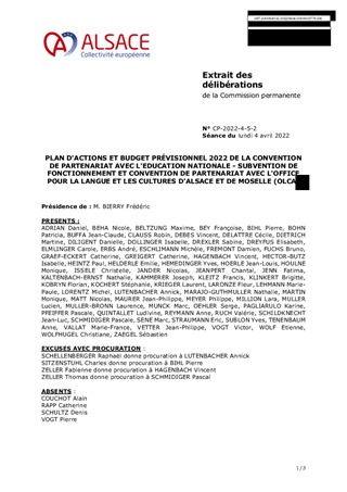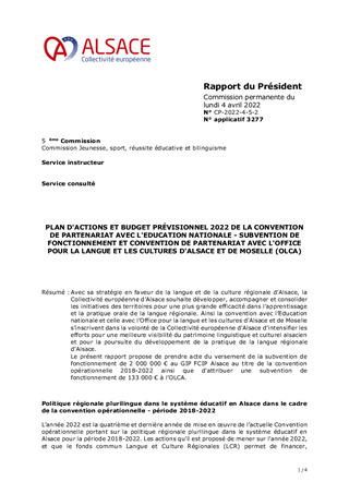 PLAN D'ACTIONS ET BUDGET PRÉVISIONNEL 2022 DE LA CONVENTION DE PARTENARIAT AVEC L'EDUCATION NATIONALE - SUBVENTION DE FONCTIONNEMENT ET CONVENTION DE PARTENARIAT AVEC L'OFFICE POUR LA LANGUE ET LES CULTURES D'ALSACE ET DE MOSELLE (OLCA)