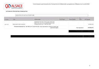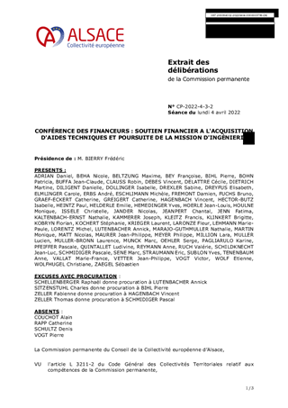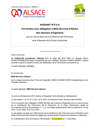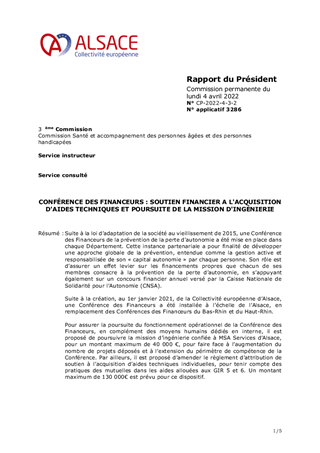 Suite à la loi d’adaptation de la société au vieillissement de 2015, une Conférence des Financeurs de la prévention de la perte d'autonomie a été mise en place dans chaque Département. Cette instance partenariale a pour finalité de développer une approche globale de la prévention, entendue comme la gestion active et responsabilisée de son « capital autonomie » par chaque personne. Son rôle est d’assurer un effet levier sur les financements propres que chacun de ses membres consacre à la prévention de la perte d’autonomie, en s’appuyant également sur un concours financier annuel versé par la Caisse Nationale de Solidarité pour l’Autonomie (CNSA). Suite à la création, au 1er janvier 2021, de la Collectivité européenne d’Alsace, une Conférence des Financeurs a été installée à l’échelle de l’Alsace, en remplacement des Conférences des Financeurs du Bas-Rhin et du Haut-Rhin. Pour assurer la poursuite du fonctionnement opérationnel de la Conférence des Financeurs, en complément des moyens humains dédiés en interne, il est proposé de poursuivre la mission d’ingénierie confiée à MSA Services d’Alsace, pour un montant maximum de 40 000 €, pour faire face à l’augmentation du nombre de projets déposés et à l’extension du périmètre de compétence de la Conférence. Par ailleurs, il est proposé d’amender le règlement d’attribution de soutien à l’acquisition d’aides techniques individuelles, pour tenir compte des pratiques des mutuelles dans les aides allouées aux GIR 5 et 6. Un montant maximum de 130 000€ est prévu pour ce dispositif.