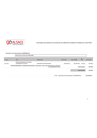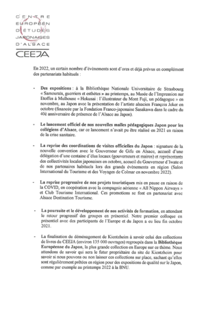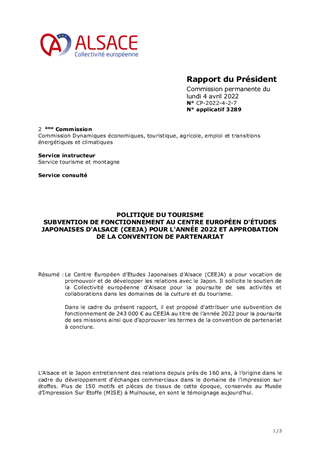 Le Centre Européen d’Etudes Japonaises d’Alsace (CEEJA) a pour vocation de promouvoir et de développer les relations avec le Japon. Il sollicite le soutien de la Collectivité européenne d'Alsace pour la poursuite de ses activités et collaborations dans les domaines de la culture et du tourisme. Dans le cadre du présent rapport, il est proposé d'attribuer une subvention de fonctionnement de 243 000 € au CEEJA au titre de l’année 2022 pour la poursuite de ses missions ainsi que d’approuver les termes de la convention de partenariat à conclure.