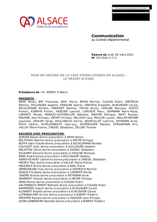 Avec le cadre législatif consolidé issu de la loi de ratification du 28 février 2022, la Collectivité européenne d’Alsace a désormais toutes les cartes en main pour être prête, à l’horizon du 1er janvier 2025, à la mise en œuvre opérationnelle d'une taxe poids lourds sur le réseau routier lui appartenant. L'objet de cette communication à l'assemblée est de donner les lignes directrices de l'action qui va être menée. Elle présente le projet R-Pass qui s’attache à préparer la taxe mais également à mettre à profit les étapes de concertation des professionnels et des alsaciens pour définir au mieux l’usage du produit de la taxe au bénéfice de l’économie alsacienne.