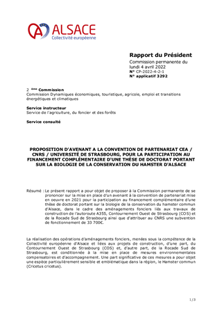 Le présent rapport a pour objet de proposer à la Commission permanente de se prononcer sur la mise en place d’un avenant à la convention de partenariat mise en oeuvre en 2021 pour la participation au financement complémentaire d’une thèse de doctorat portant sur la biologie de la conservation du hamster commun d’Alsace, dans le cadre des aménagements fonciers liés aux travaux de construction de l’autoroute A355, Contournement Ouest de Strasbourg (COS) et de la Rocade Sud de Strasbourg ainsi que d'attribuer au CNRS une subvention de fonctionnement de 33 700€.