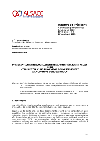 La Collectivité européenne d’Alsace a approuvé en séance plénière du 18 octobre 2021 un dispositif d’aides en faveur de la préservation et du renouvellement des arbres têtards. Il est proposé d'attribuer une subvention d'investissement de 4 000 euros pour l'entretien de 20 arbres têtards sur la commune de ROESCHWOOG.