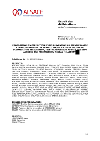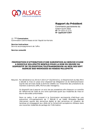 PROPOSITION D'ATTRIBUTION D'UNE SUBVENTION AU SERVICE D'AIDE A DOMICILE MILLEPATTE BENFELD POUR LA MISE EN OEUVRE DU DISPOSITIF DE TELEGESTION/TELETRANSMISSION AU SEIN DES SEPT AGENCES BAS-RHINOISES DU RESEAU MILLEPATTE