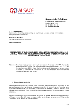 Dans le cadre du présent rapport, il est proposé d'accorder à l'ADIRA, Agence de développement d'Alsace, une subvention de fonctionnement de 2 162 107 € au titre de l'exercice 2022. Il est également demandé d'approuver la convention financière y afférente et d'autoriser le 1er Vice-Président de la Collectivité européenne d'Alsace à la signer.