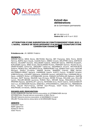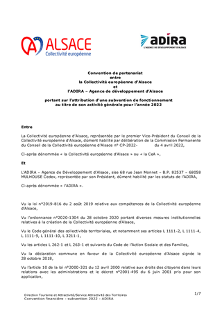 ATTRIBUTION D'UNE SUBVENTION DE FONCTIONNEMENT POUR 2022 A L'ADIRA,AGENCE DE DEVELOPPEMENT D'ALSACE ET SIGNATURE D'UNE CONVENTION FINANCIERE