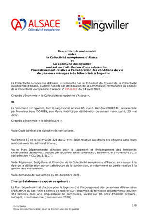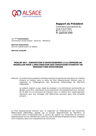 La Collectivité européenne d'Alsace soutient les actions de résorption de l'habitat précaire et indigne, dans le cadre du Plan Départemental d'Action pour le Logement et l'Hébergement des Personnes Défavorisées du Bas-Rhin (PDALHPD). Le présent rapport a pour objet de proposer à la Commission permanente de décider, à ce titre, l'attribution d'une subvention d'investissement d'un montant de 25 000 € à la Commune de Ingwiller pour la création d'un assainissement autonome pour des ménages très défavorisés occupant deux sites d'habitat précaire.