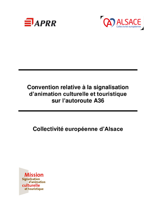 La Collectivité européenne d’Alsace mène une démarche d’actualisation de la signalisation d’animation culturelle et touristique sur les parties haut-rhinoises de l’A35 et de l’A36 pour valoriser les sites majeurs des territoires alsaciens. Ainsi, le présent rapport propose à la Commission permanente : - de valider les thèmes qui figureront sur les panneaux d’animation touristique et culturelle sur les autoroutes A35 et A36, partie haut-rhinoise, selon la liste annexée au présent rapport ; - de participer au financement de la création des panneaux sur la partie de l'A36 concédée à APRR à hauteur de 86 400 € ; - d’approuver la convention de partenariat à conclure entre la Collectivité européenne d’Alsace et APRR.