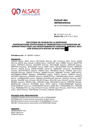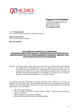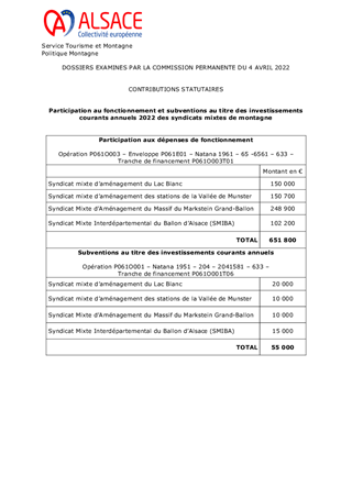 Le présent rapport a pour objet de prendre acte du versement de la participation aux dépenses de fonctionnement pour un montant de 651 800 € et de l'attribution des subventions aux investissements courants annuels pour un montant de 55 000 €, au titre des contributions statutaires 2022, en faveur des syndicats mixtes d’aménagement de montagne du Lac Blanc, de la Vallée de Munster, du Markstein Grand-Ballon et du Ballon d'Alsace.