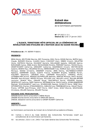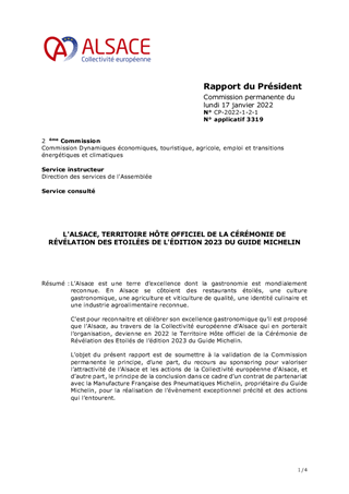 L’Alsace est une terre d’excellence dont la gastronomie est mondialement reconnue. En Alsace se côtoient des restaurants étoilés, une culture gastronomique, une agriculture et viticulture de qualité, une identité culinaire et une industrie agroalimentaire reconnue. C’est pour reconnaitre et célébrer son excellence gastronomique qu’il est proposé que l’Alsace, au travers de la Collectivité européenne d’Alsace qui en porterait l’organisation, devienne en 2022 le Territoire Hôte officiel de la Cérémonie de Révélation des Etoilés de l’édition 2023 du Guide Michelin. L’objet du présent rapport est de soumettre à la validation de la Commission permanente le principe, d’une part, du recours au sponsoring pour valoriser l’attractivité de l’Alsace et les actions de la Collectivité européenne d’Alsace, et d’autre part, le principe de la conclusion dans ce cadre d’un contrat de partenariat avec la Manufacture Française des Pneumatiques Michelin, propriétaire du Guide Michelin, pour la réalisation de l’évènement exceptionnel précité et des actions qui l’entourent.