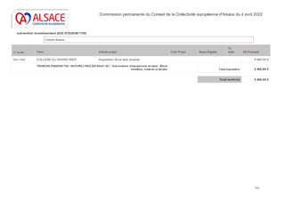 La Collectivité européenne d’Alsace est responsable de la construction, de la reconstruction, de l'extension, des grosses réparations des bâtiments, de l'équipement, du fonctionnement, de l’accueil, de la restauration, de l’hébergement, de l’entretien général et technique, du recrutement et de la gestion des personnels techniciens, ouvriers et de service exerçant leurs missions dans les collèges publics du Bas-Rhin. Le Bas-Rhin et le Haut-Rhin présentent des systèmes de financement du fonctionnement aux collèges publics différents, cette différence qui se poursuivra jusqu’à l’élaboration d’une nouvelle politique de dotation de fonctionnement, attendue pour le 1er janvier 2023. L’une des différences réside dans le versement de subventions d’investissement aux collèges publics du Bas-Rhin pour l’acquisition d’équipements et matériels divers. Le présent rapport a pour objet de proposer à la Commission Permanente d’attribuer des subventions d'investissement aux collèges publics du Bas-Rhin pour l'acquisition d'équipements divers, pour un montant total de 45 331 €.