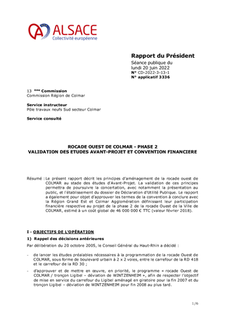 Le présent rapport décrit les principes d’aménagement de la rocade ouest de COLMAR au stade des études d'Avant-Projet. La validation de ces principes permettra de poursuivre la concertation, avec notamment la présentation au public, et l'établissement du dossier de Déclaration d'Utilité Publique. Le rapport a également pour objet d’approuver les termes de la convention à conclure avec la Région Grand Est et Colmar Agglomération définissant leur participation financière respective au projet de la phase 2 de la rocade Ouest de la Ville de COLMAR, estimé à un coût global de 46 000 000 € TTC (valeur février 2018).