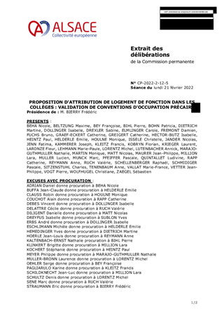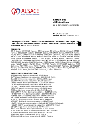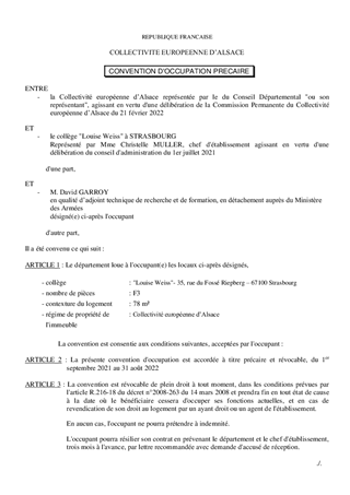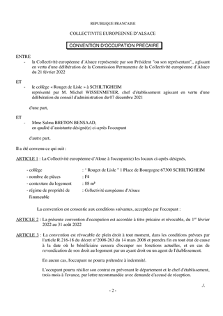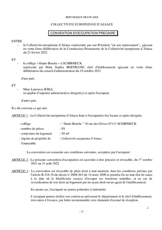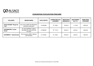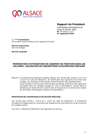 La Collectivité européenne d'Alsace décide, aux termes des articles L.213-4 et L.213-7 du code de l'éducation, de l'attribution des logements de service des collèges, sur proposition des conseils d'administration des établissements. Il est proposé à la Commission Permanente de décider d'attribuer des logements inoccupés dans les collèges Rouget de Lisle à Schiltigheim, Louise Weiss à Strasbourg et Haute-Bruche à Schirmeck et d'approuver les termes des projets de convention d'occupation précaire correspondants.