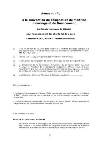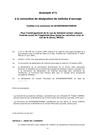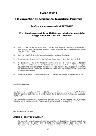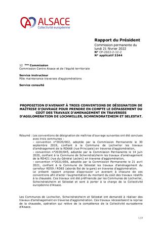 Les conventions de désignation de maîtrise d’ouvrage suivantes ont été conclues avec trois communes : - convention n°2020/002, adoptée par la Commission Permanente le 30 septembre 2019, confiant à la Commune de Lochwiller les travaux d’aménagement de la RD668 (rue Principale) en traverse d’agglomération, - convention n°2020/045, adoptée par la Commission Permanente le 14 juin 2020, confiant à la Commune de Schwindratzheim les travaux d’aménagement de la RD421 (rue du Général Leclerc) en traverse d’agglomération, - convention n°2021/056, adoptée par la Commission Permanente le 21 avril 2021, confiant à la Commune de Sélestat les travaux d’aménagement du carrefour RD59 / RD83 (abords Est de la gare) en traverse d’agglomération. Le présent rapport propose d’approuver un avenant à chacune de ces conventions afin d’acter l’augmentation du montant du coût des travaux relatifs à la chaussée. Ces travaux ont été préfinancés par les Communes de Lochwiller, Schwindratzheim et Sélestat et sont à porter à la charge de la Collectivité européenne d’Alsace.