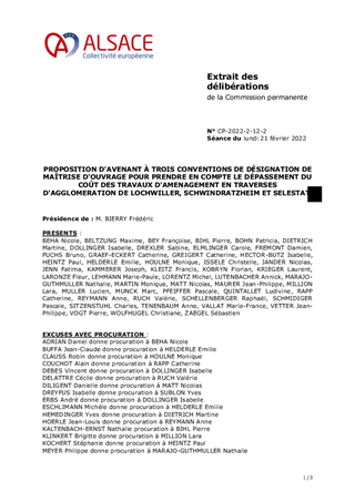 PROPOSITION D'AVENANT À TROIS CONVENTIONS DE DÉSIGNATION DE MAÎTRISE D'OUVRAGE POUR PRENDRE EN COMPTE LE DÉPASSEMENT DU COÛT DES TRAVAUX D'AMENAGEMENT EN TRAVERSES D'AGGLOMERATION DE LOCHWILLER, SCHWINDRATZHEIM ET SELESTAT.