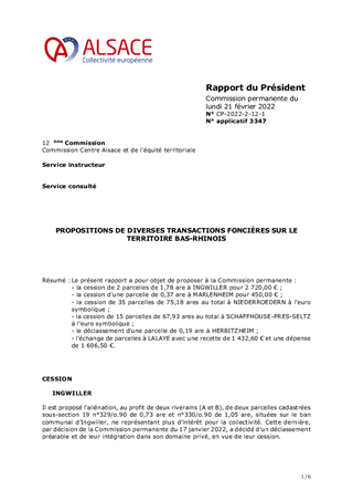 Le présent rapport a pour objet de proposer à la Commission permanente : - la cession de 2 parcelles de 1,78 are à INGWILLER pour 2 720,00 € ; - la cession d'une parcelle de 0,37 are à MARLENHEIM pour 450,00 € ; - la cession de 35 parcelles de 75,18 ares au total à NIEDERROEDERN à l'euro symbolique ; - la cession de 15 parcelles de 67,93 ares au total à SCHAFFHOUSE-PRES-SELTZ à l'euro symbolique ; - le déclassement d'une parcelle de 0,19 are à HERBITZHEIM ; - l'échange de parcelles à LALAYE avec une recette de 1 432,60 € et une dépense de 1 696,50 €.