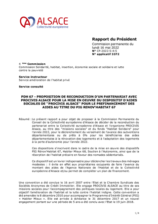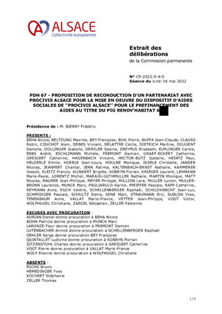 PDH 67 - PROPOSITION DE RECONDUCTION D'UN PARTENARIAT AVEC PROCIVIS ALSACE POUR LA MISE EN OEUVRE DU DISPOSITIF D'AIDES SOCIALES DE ''PROCIVIS ALSACE'' POUR LE PREFINANCEMENT DES AIDES AU TITRE DU PIG RENOV'HABITAT 67